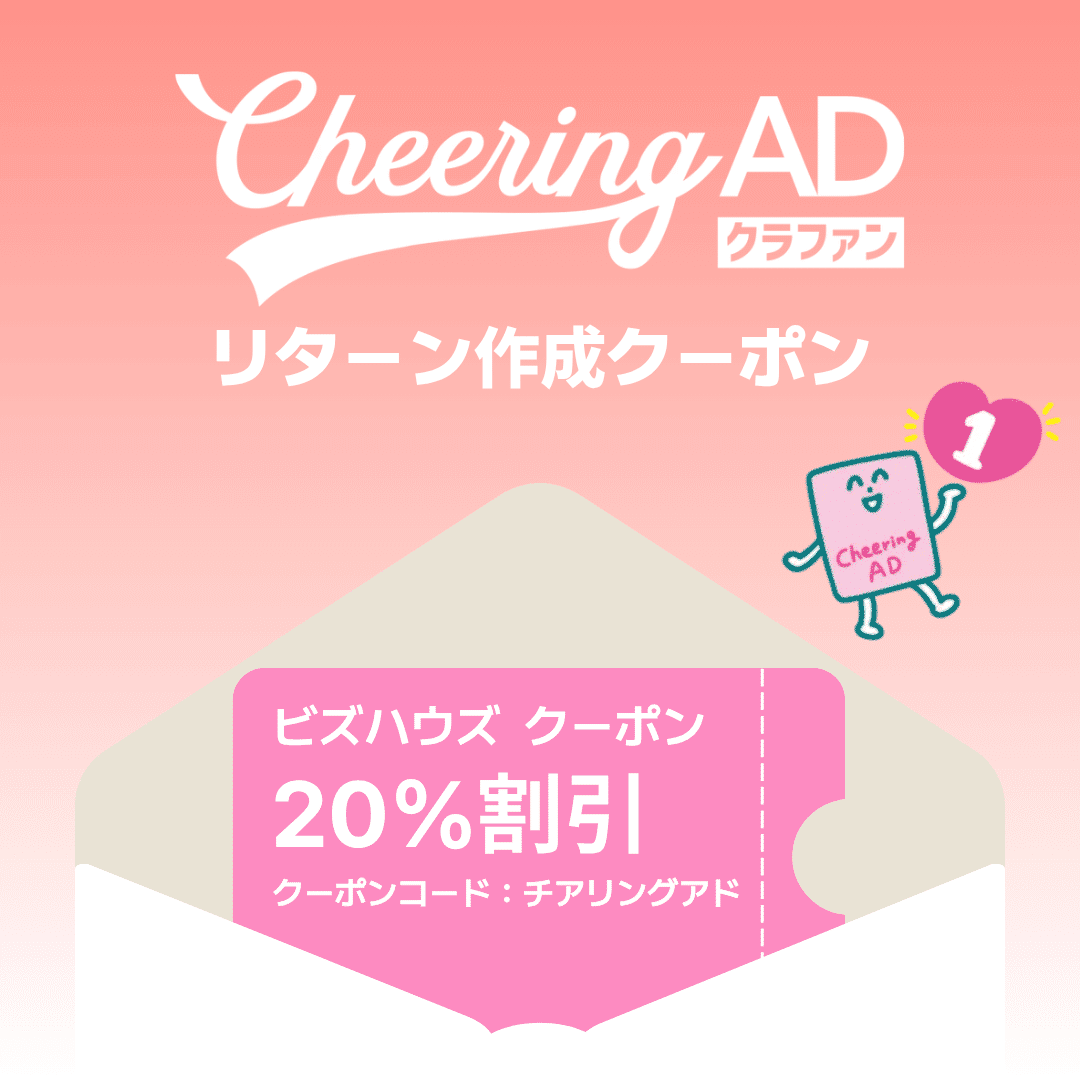 ビズハウズ ログイン後、注文ページでクーポン利用→クーポンコード 「チアリングアド」 を入力すると、ご利用金額の20%割引(最大10万円まで) が適用されます。
