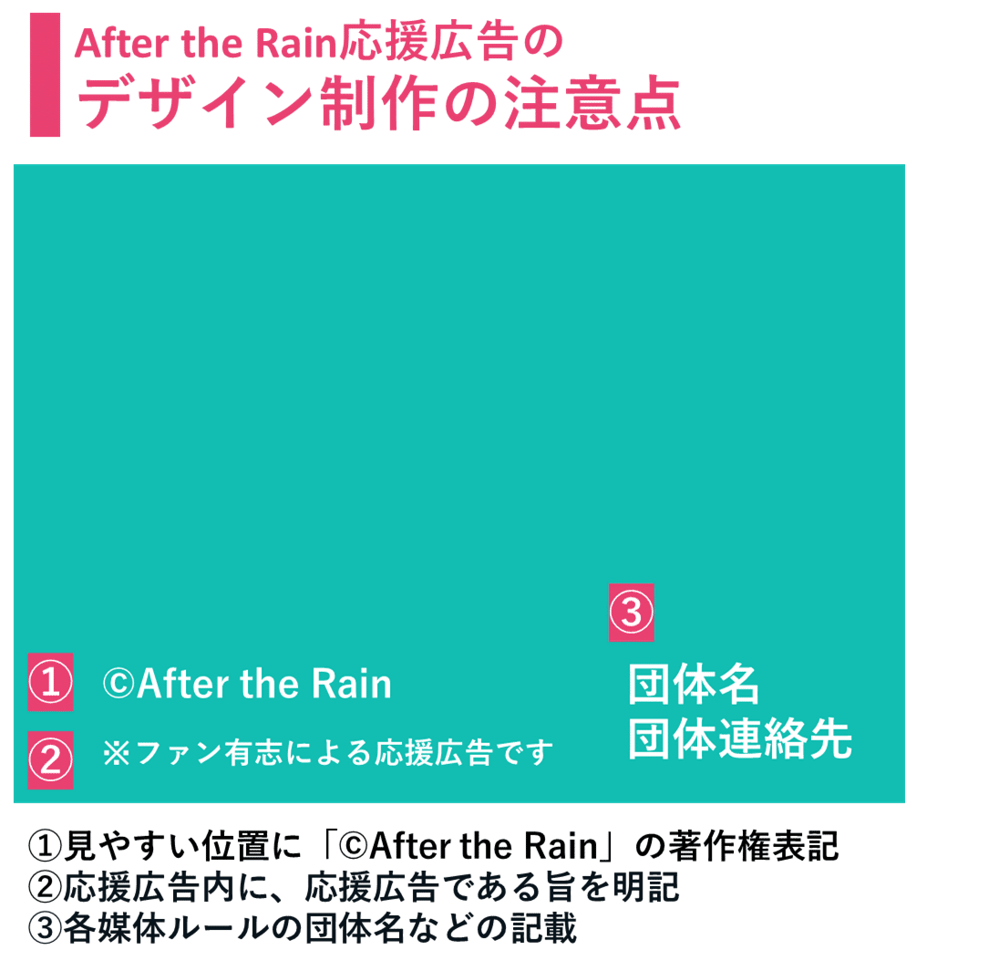 応援広告を掲出する際は、After the Rain応援広告規程を守っていただく必要があります。