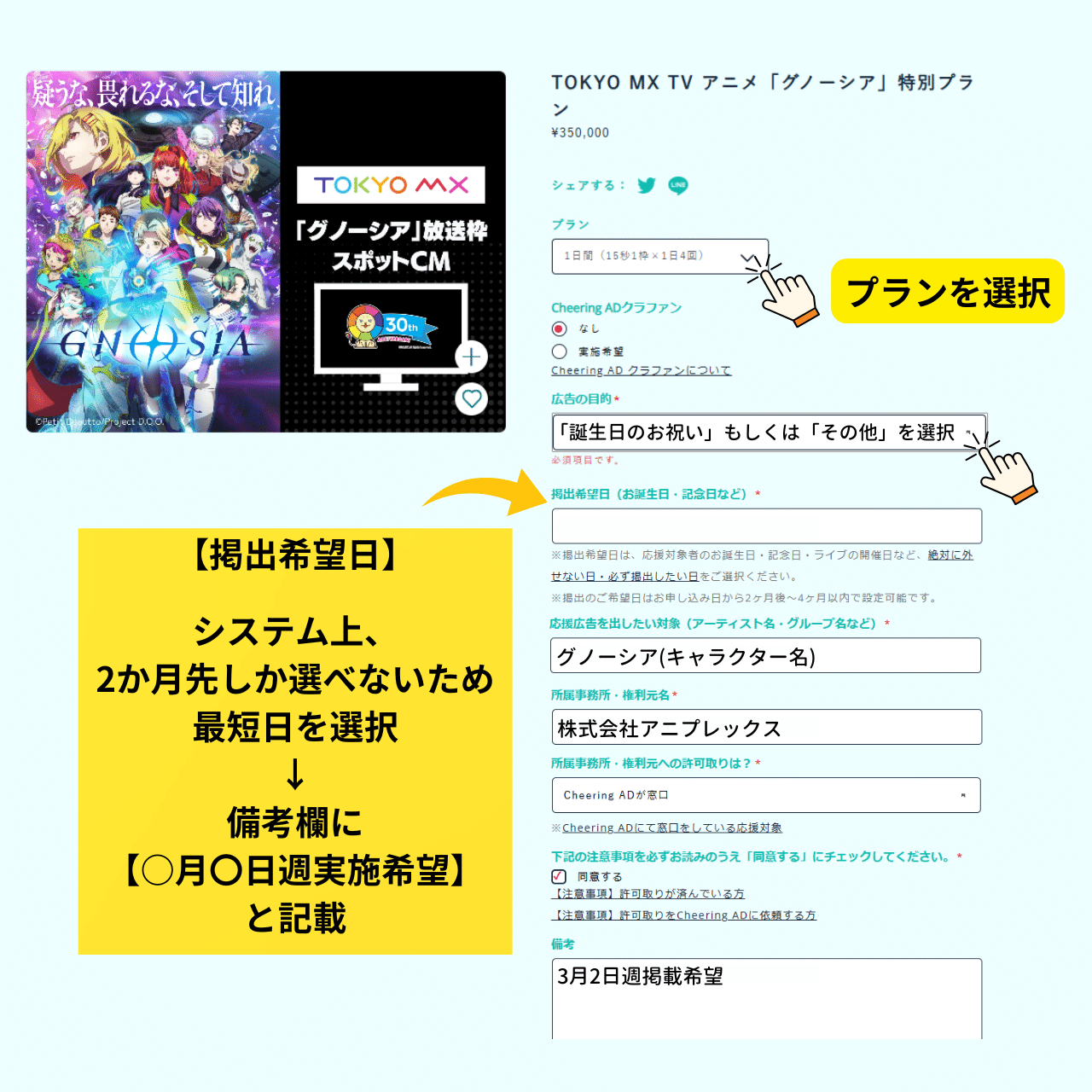 *Due to the system, you will not be able to select the "desired posting date" if the deadline is less than 2 months, so please select the shortest available posting date and write "●/● desired posting date" in the notes column.