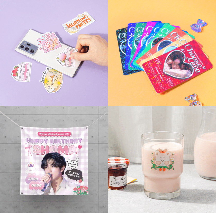 Stickers, trading cards, magnets, and can badges that can be produced in large quantities at low prices.