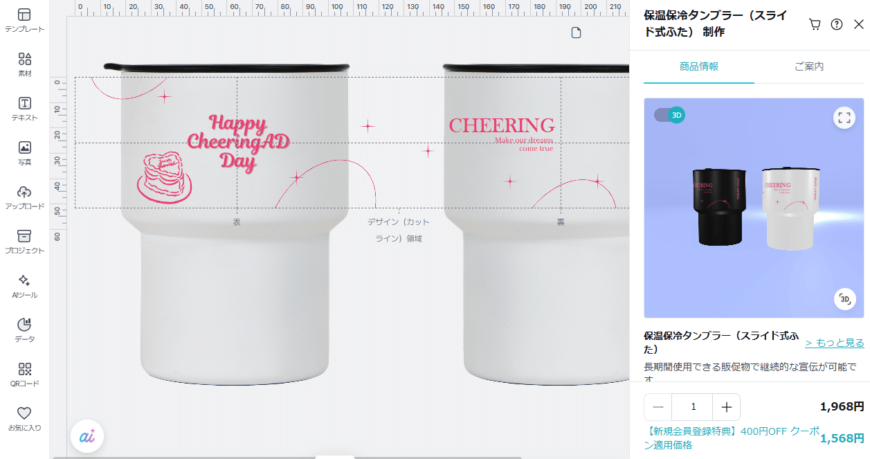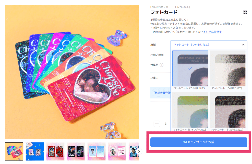 Decide on the goods you want to make, the processing, quantity, etc., and select "Create design on the web".