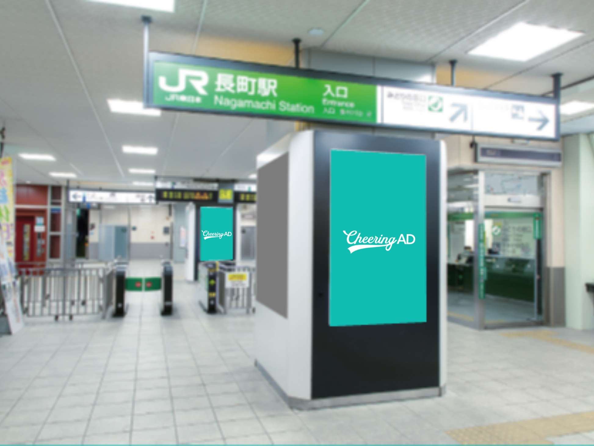 -Aobadori Station의 티켓 문 외부에는 3 개의 "J.ad Vision"표면이 설치되었습니다.