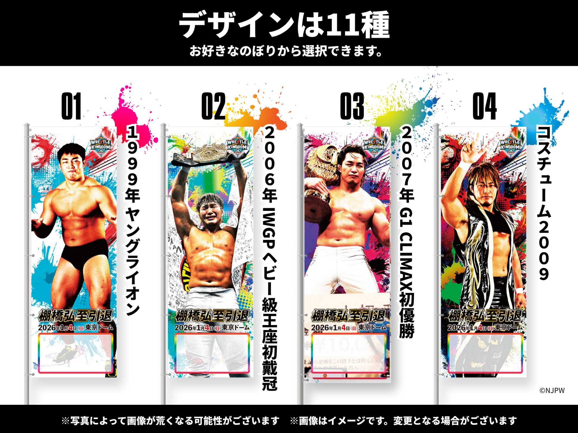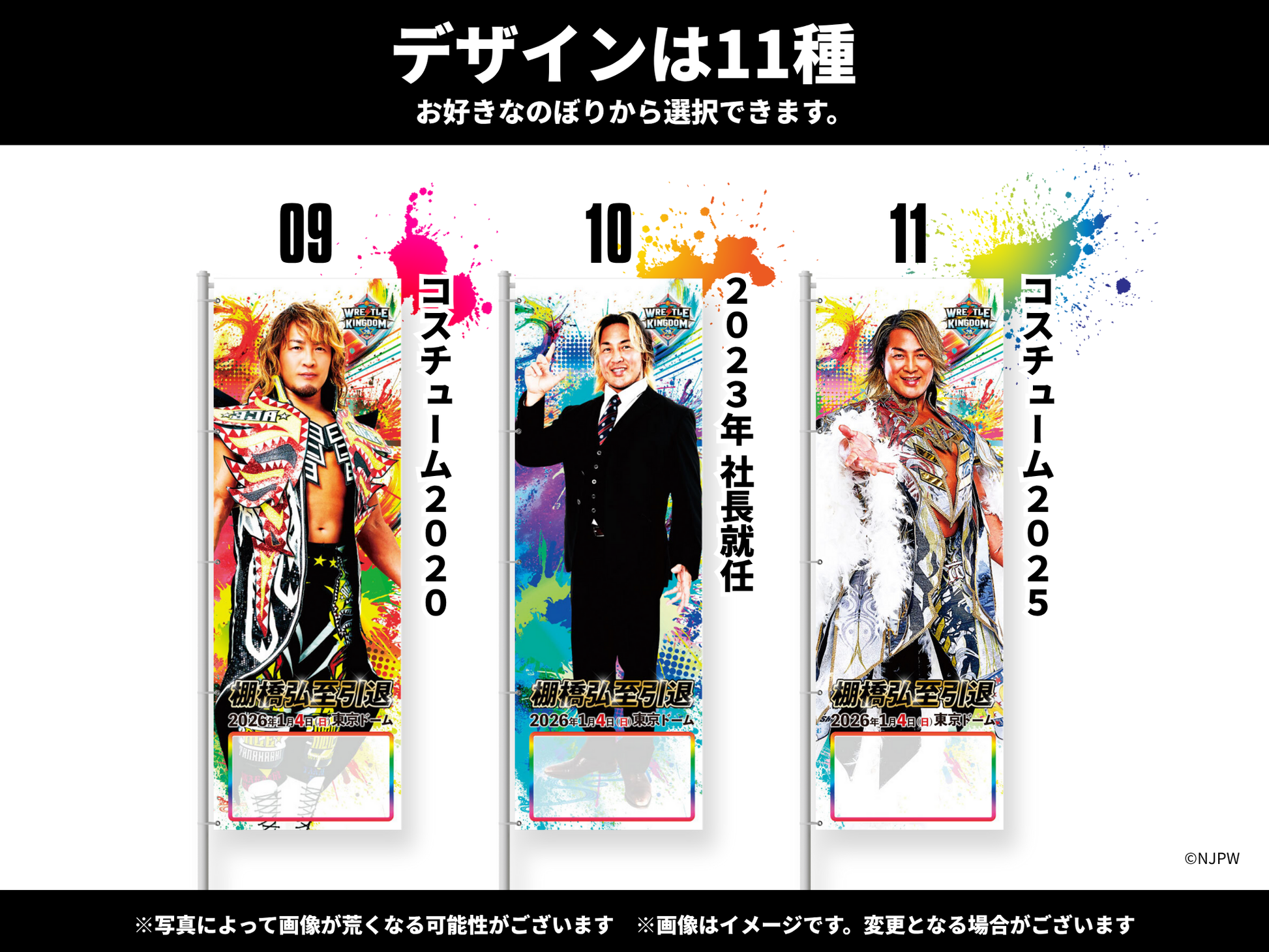 お選びいただいたデザインに、棚橋選手へのメッセージとニックネームを入れていただくと、東京ドーム周辺に掲出され、後日その応援のぼりを棚橋選手の直筆サイン入りでお届けします。