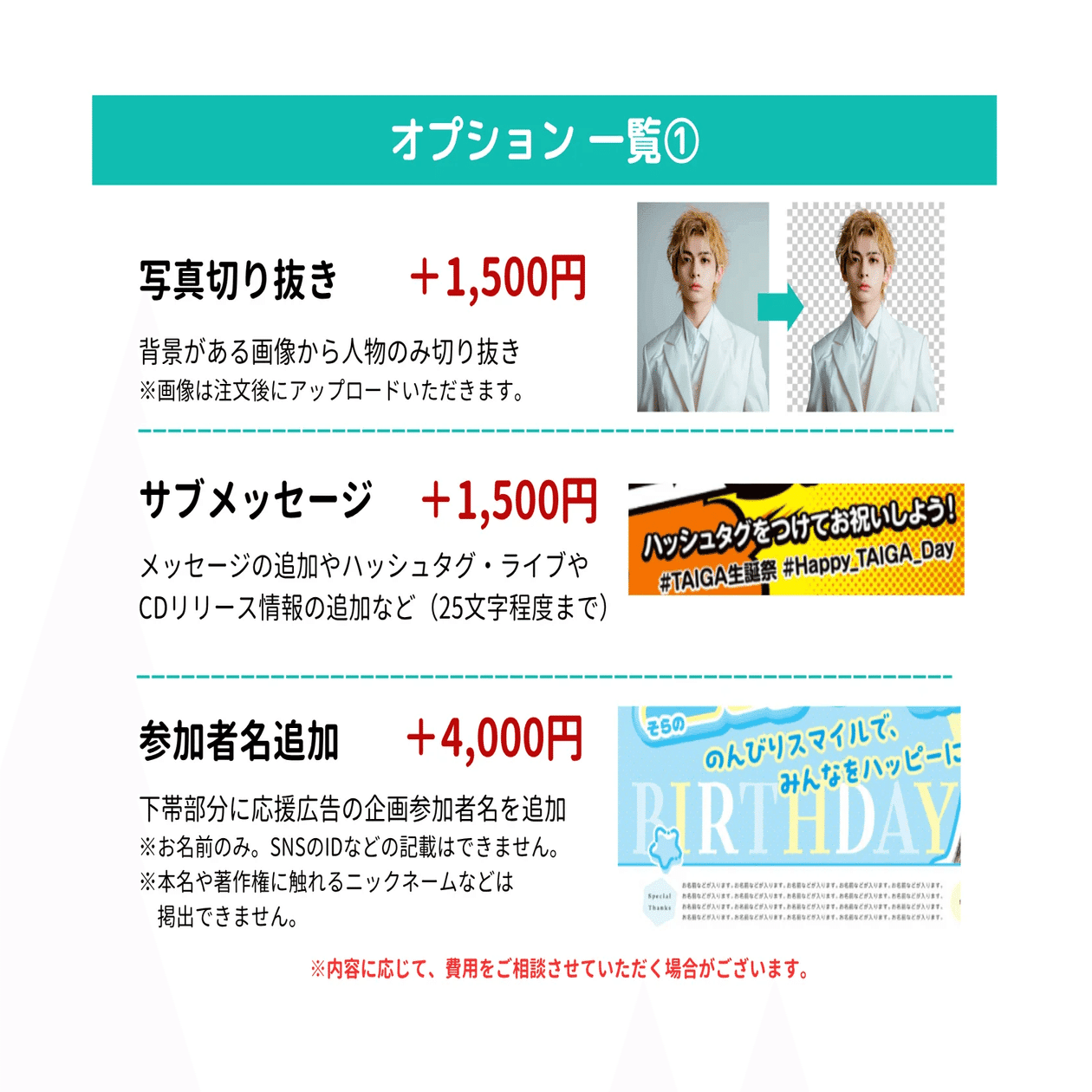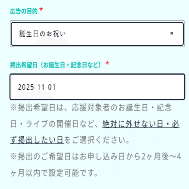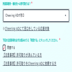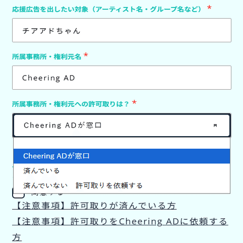 请输入您喜欢的偶像,组名称和代理信息的名称,这些信息将作为支持广告发布。另外,如果您有办公室的许可证,请根据您的情况进行选择。